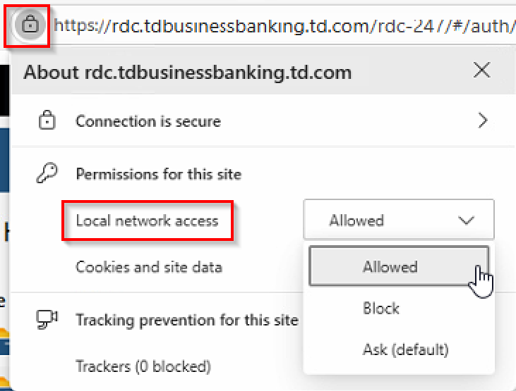 - In the browser, select the Lock icon located next to the TD RDC URL.